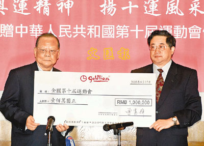 捐贈(zèng)儀式昨天上午在香港金利來(lái)公司內(nèi)舉行,江蘇省人民政府副秘書長(zhǎng)兼第10屆全國(guó)運(yùn)動(dòng)會(huì)組委會(huì)副秘書長(zhǎng)吳經(jīng)起,代表江蘇省政府及全運(yùn)會(huì)組委會(huì)接受了捐款支票。并代表省長(zhǎng)梁寶華、代表第十屆全國(guó)運(yùn)動(dòng)會(huì)組委會(huì)和江蘇省政府對(duì)曾憲梓博士表示崇高敬意和衷心感謝。