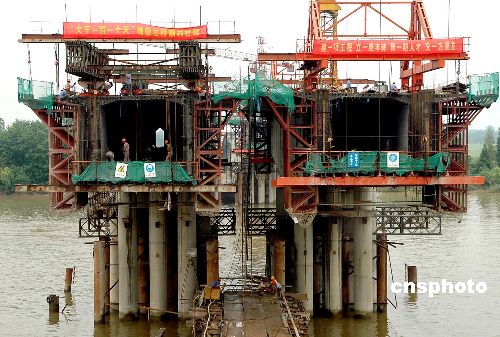 8月17日,江蘇揚(yáng)州京杭運(yùn)河大橋建設(shè)開始進(jìn)入上部箱梁澆鑄。該大橋是正在建設(shè)中的南京至南通公路上的重點(diǎn)工程,全長697米,經(jīng)過15個(gè)月的建設(shè),大橋下部結(jié)構(gòu)已全面完工,上部箱梁澆鑄現(xiàn)以每周4米的速度向兩邊擴(kuò)展,預(yù)計(jì)大橋?qū)⒃?1月底合攏。作者:張丙濤