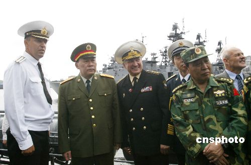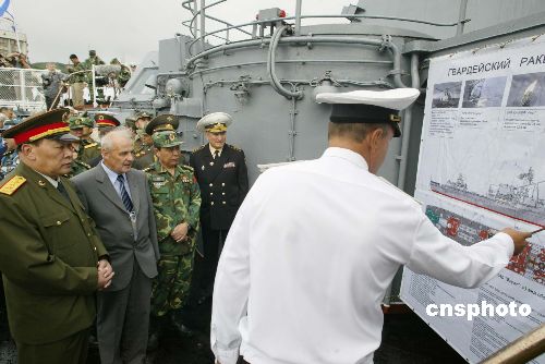 十八日傍晚,中國解放軍總參謀長梁光烈上將(左二),在俄羅斯太平洋艦隊基地參觀“瓦里亞克”巡洋艦時,聽取俄羅斯軍官介紹情況,太平洋艦隊司令費奧多羅夫海軍上將(左三)、中俄聯合軍事演習中方總指揮葛振峰上將陪同參觀。作者:王麗南