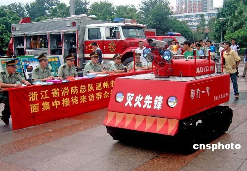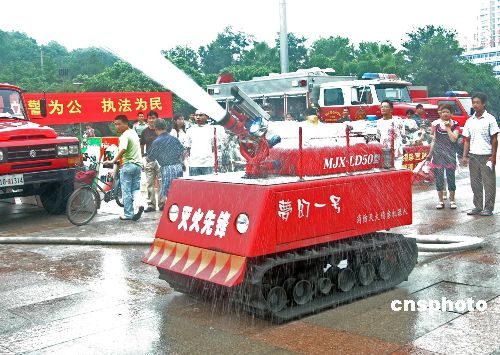 2005年8月21日上午,一輛坦克形狀的消防機(jī)器人在浙江省溫州市亮相,并在指揮人員的操控下現(xiàn)場(chǎng)進(jìn)行演練,讓市民大開眼界。據(jù)了解,這輛無(wú)人駕駛的機(jī)器人可以在極度危險(xiǎn)環(huán)境下開展滅火。作者:劉飛