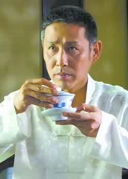 漫長的染發(fā)過程之后,陳道明親自從上海專門訂做的幾十件真絲印花唐裝里,很快挑選了一套白色套裝。換上衣服后,他左手持鑲金梨木拐杖,右手搖著寫有“蘭亭”二字的折扇,向在場的劇組工作人員展現(xiàn)了他精心設(shè)計的花白發(fā)、瘸腿新造型。
