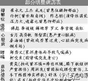 據(jù)法制晚報(bào)報(bào)道,醫(yī)生和健康專家日前指出,明星們的部分生活方式使他們?cè)诰窈腕w力上普遍呈過(guò)勞狀態(tài),并對(duì)健康造成致命威脅。而且,這些明星高發(fā)病同樣也威脅著普通人的健康。