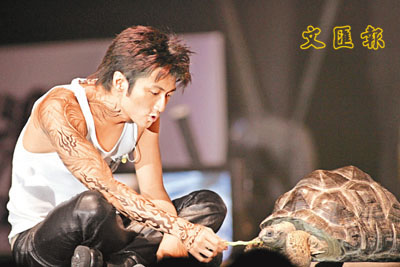 中新網(wǎng)8月23日電 據(jù)文匯報(bào)報(bào)道,達(dá)明一派與謝霆鋒首度合作的“同場異夢音樂會”,前晚在會展舉行,近年人氣不繼的霆鋒,為求搶鏡竟連家中的八十磅巨龜也要出動,又罔顧觀眾安危,突然飛身跳向觀眾席的觀眾,累及部分觀眾跌地上,幸好未有釀成意外。