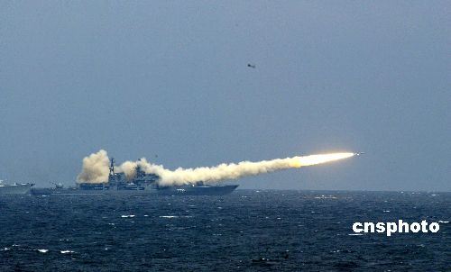 “和平使命-2005”中俄聯(lián)合軍事演習(xí)第三階段8月23日在中國山東半島及其附近海域舉行。圖為俄羅斯驅(qū)逐艦發(fā)射先進(jìn)的反艦導(dǎo)彈。作者:王麗南