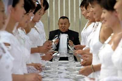 昨天,奧體中心游泳館的一個(gè)平臺(tái)上,一下子出現(xiàn)了三十位身穿白色婚紗的新娘,這個(gè)場(chǎng)面難道是有人在這里組織集體婚禮?看到一旁的攝影機(jī),才知道原來(lái)這里是潘長(zhǎng)江處女專(zhuān)輯《男人40一枝花》同名歌曲MV的拍攝現(xiàn)場(chǎng)。一張長(zhǎng)條桌子兩側(cè)站著30位漂亮的新娘,而眾星捧月之中是身穿黑色燕尾服的笑星潘長(zhǎng)江。最搞笑的是當(dāng)老潘揭開(kāi)面前一只巨大的盤(pán)子蓋,原以為是大餐的他失望地發(fā)現(xiàn)里面只放著一個(gè)小漢堡。