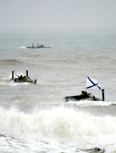 八月二十四日,盡管山東半島天氣惡劣“和平使命—2005”中俄聯(lián)合軍事演習(xí)兩棲登陸作戰(zhàn)實(shí)兵演練如期進(jìn)行。圖為參加兩棲登陸作戰(zhàn)演練的陸戰(zhàn)隊(duì)員乘裝甲運(yùn)兵車劈浪向岸邊靠近。作者:王麗南