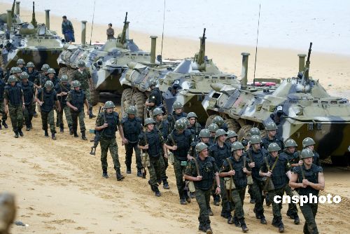 八月二十四日,山東半島雨水不斷,“和平使命—2005”中俄聯(lián)合軍事演習(xí)兩棲登陸作戰(zhàn)實兵演練如期進行。圖為完成登陸任務(wù)后的俄羅斯陸戰(zhàn)隊員,在海邊等待裝船返航。作者:王麗南
