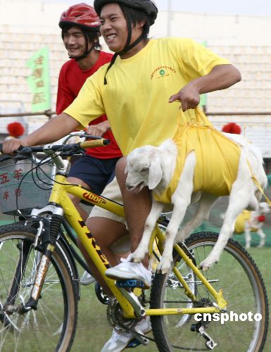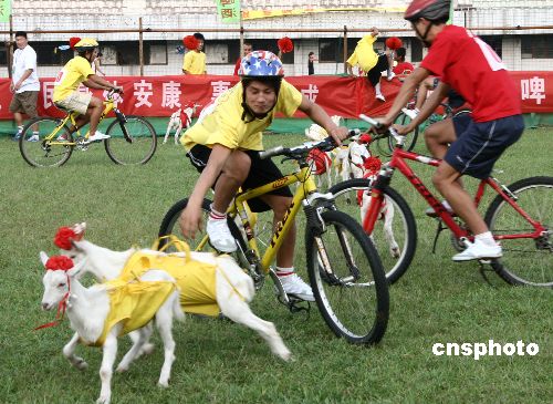 8月26日,“全國首屆自行車叼羊大賽”在山東省棗莊市舉行。比賽規(guī)定每次上場的2支參賽隊(duì)各派出4名自行車隊(duì)員,參賽隊(duì)員只有把代表自己隊(duì)伍顏色的5只小山羊叼回“羊圈”后,才有權(quán)去叼那只“公共羊”,最先叼回“公共羊”的代表隊(duì)獲勝。這次共有10支自行車代表隊(duì)參加了角逐比賽。作者:吉喆