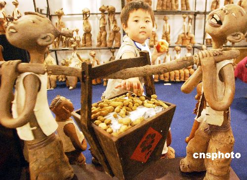 八月二十八日,正在北京舉行的“2005中國藝術(shù)博覽會”上,匯集了來自中國各地的百家藝術(shù)品經(jīng)營機構(gòu)和五百名中外藝術(shù)家,在參展的作品中別具特色中國陶藝藝術(shù)品引人注目。圖為由中央美術(shù)學(xué)院藝術(shù)研究院的鄭玉奎創(chuàng)作的陶藝作品《農(nóng)家樂》充滿濃厚的鄉(xiāng)土氣息,造型活潑、生動感人。作者:錢興強
