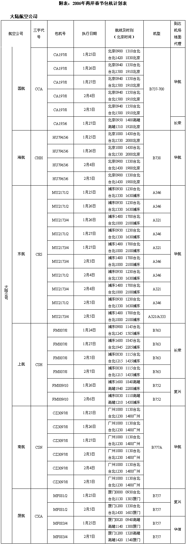 兩岸各執(zhí)行36個往返航班,具體見表(如有變動最后以各航空公司公布為準)。