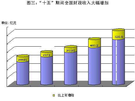 2005年是“十五”計(jì)劃的最后一年;仡欉^(guò)去的五年,國(guó)家財(cái)政面貌發(fā)生了新的變化,主要是:國(guó)家財(cái)政實(shí)力不斷壯大。全國(guó)財(cái)政收入連續(xù)突破2萬(wàn)億元、2.5萬(wàn)億元和3萬(wàn)億元大關(guān)!笆濉睍r(shí)期全國(guó)財(cái)政收入為11.5萬(wàn)億元,比“九五”時(shí)期增加6.4萬(wàn)億元,增長(zhǎng)126.5%,其中中央財(cái)政本級(jí)收入增長(zhǎng)141.5%,地方財(cái)政本級(jí)收入增長(zhǎng)111.3%!笆濉蹦2005年全國(guó)財(cái)政收入占GDP比重為17.3%,比“九五”末2000年的13.5%上升了3.8個(gè)百分點(diǎn)。全國(guó)財(cái)政支出為12.8萬(wàn)億元,比“九五”時(shí)期增加7.1萬(wàn)億元,增長(zhǎng)124%,其中中央財(cái)政本級(jí)支出增長(zhǎng)109.5%,地方財(cái)政本級(jí)支出增長(zhǎng)130.5%。財(cái)政收入增長(zhǎng)的穩(wěn)定性和協(xié)調(diào)性進(jìn)一步增強(qiáng),財(cái)政發(fā)展的步伐不斷加快。財(cái)政宏觀調(diào)控作用不斷增強(qiáng)。根據(jù)經(jīng)濟(jì)發(fā)展的客觀需要,相機(jī)調(diào)整并順利實(shí)現(xiàn)了積極財(cái)政政策向穩(wěn)健財(cái)政政策的轉(zhuǎn)變,促進(jìn)了經(jīng)濟(jì)保持平穩(wěn)較快發(fā)展。在認(rèn)真總結(jié)財(cái)政政策實(shí)踐的基礎(chǔ)上,建立健全了基本適應(yīng)通貨膨脹、通貨緊縮、供求總量基本平衡但結(jié)構(gòu)不均衡等不同經(jīng)濟(jì)運(yùn)行形態(tài)需要的,包括目標(biāo)定位、政策組合、時(shí)機(jī)選擇、組織實(shí)施等一系列要素在內(nèi)的財(cái)政宏觀調(diào)控體系。以人為本的公共支出體系不斷完善。按照科學(xué)發(fā)展觀和社會(huì)主義市場(chǎng)經(jīng)濟(jì)發(fā)展的要求,大力調(diào)整和優(yōu)化支出結(jié)構(gòu),不斷減少并逐步退出對(duì)一般競(jìng)爭(zhēng)性、經(jīng)營(yíng)性領(lǐng)域的財(cái)政投入;大力支持義務(wù)教育、就業(yè)和社會(huì)保障、公共衛(wèi)生等公益性社會(huì)事業(yè)的改革和發(fā)展;向困難地區(qū)、行業(yè)和群眾傾斜,注意解決事關(guān)人民群眾切身利益的突出矛盾和問(wèn)題,把實(shí)現(xiàn)好、維護(hù)好、發(fā)展好最廣大人民群眾的根本利益作為財(cái)政支出的出發(fā)點(diǎn)和落腳點(diǎn)。公共財(cái)政管理體制改革不斷深化。積極推進(jìn)出口退稅機(jī)制改革、增值稅轉(zhuǎn)型、個(gè)人所得稅及所得稅收入分享改革,深化預(yù)算管理制度改革,支持其他方面經(jīng)濟(jì)體制改革;推動(dòng)財(cái)政法制建設(shè)、加強(qiáng)會(huì)計(jì)基礎(chǔ)工作、轉(zhuǎn)變財(cái)政監(jiān)督方式,進(jìn)一步健全了公共財(cái)政管理框架。