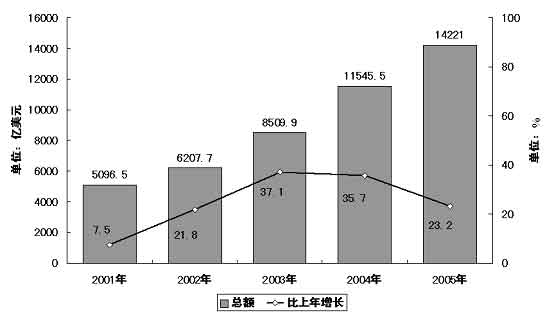 圖表五 “十五”期間外貿(mào)進(jìn)出口總額及其增長情況