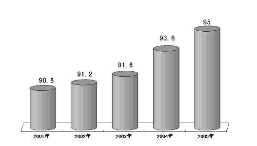 圖表七 “十五”期間全國義務(wù)教育人口覆蓋率 (單位:%)