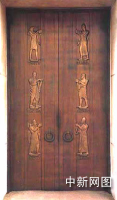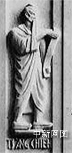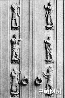 倉頡(TS'ANG CHIE)的雕像是在東側(cè)大銅門上(左扇門第二個(gè))。國會(huì)圖書館對倉頡的概括是“中國文學(xué)的庇護(hù)神”(the Chinese patron of writing)。顯然,這種評(píng)價(jià)比我們傳統(tǒng)上所認(rèn)為的倉頡是造字圣人更高了一步。與倉頡雕像放在一起的還有透特(埃及神話中的月神)、納布(美索不達(dá)米亞阿卡德人的神)、梵天(印度教三大神之一創(chuàng)造之神)、 腓尼基王子卡德摩斯(希臘神話中能夠“播種龍牙”的神) 以及古代波斯人的英雄塔赫穆拉斯。