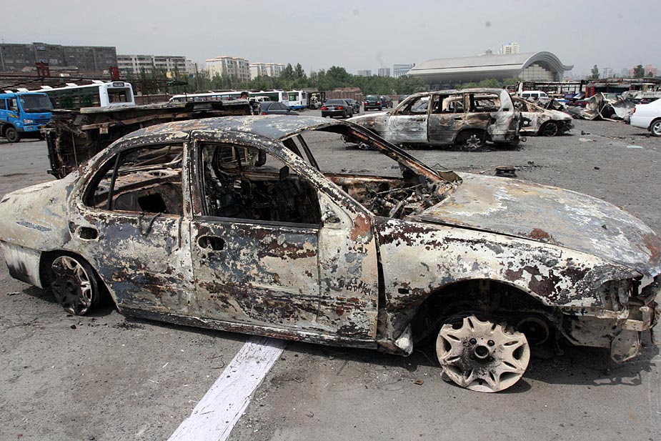 7月6日,烏魯木齊街頭被犯罪分子焚毀的汽車慘不忍睹。在5日晚發(fā)生的嚴重暴力犯罪事件中,已造成140人死亡,800多人受傷;被毀車輛達260部;受損門面房203間,民房14間,總過火面積達到56850平方米,全市共有220多處縱火點,有兩棟樓房被燒毀。中新社發(fā) 夏春平 攝