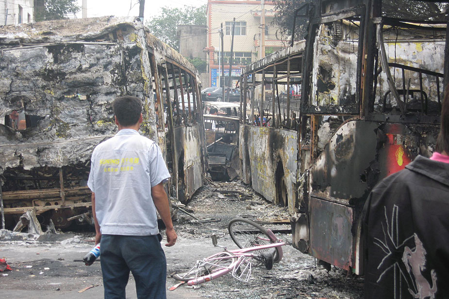 7月6日,烏魯木齊市一位市民注目被犯罪分子焚燒的汽車。在7月5日晚發(fā)生的嚴重暴力犯罪事件中,被毀車輛達260部。 中新社發(fā) 鐘新 攝