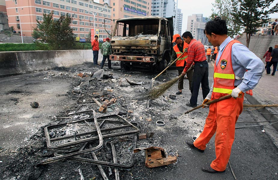 7月6日,烏魯木齊市的工作人員在清理被犯罪分子焚燒的汽車。在5日晚發(fā)生的嚴(yán)重暴力犯罪事件中,被毀車輛達(dá)260部;受損門面房203間,民房14間,總過(guò)火面積達(dá)到56850平方米,全市共有220多處縱火點(diǎn),有兩棟樓房被燒毀。中新社發(fā) 劉新 攝