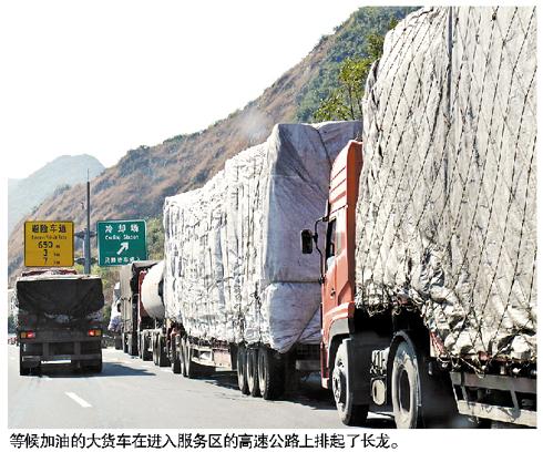 前天上午,巡邏民警從京港澳高速韶關(guān)段北上,只見(jiàn)乳源服務(wù)區(qū)入口、云巖服務(wù)區(qū)南行入口均有長(zhǎng)達(dá)一公里左右的加油車(chē)龍。據(jù)了解,近日京珠北各服務(wù)區(qū)都出現(xiàn)大貨車(chē)排隊(duì)進(jìn)服務(wù)區(qū)加油的現(xiàn)象,南下的大貨車(chē)在湖南境內(nèi)每次只能加到200元的柴油,在京珠北境內(nèi)服務(wù)一次加油最多也是400元,限量供應(yīng)柴油造成了大貨車(chē)逢服務(wù)區(qū)必須進(jìn)站加油。行駛的大型車(chē)缺油、車(chē)龍?jiān)诼访媾抨?duì)進(jìn)服務(wù)區(qū)加油都給交通安全帶來(lái)壓力。