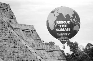 28日,在墨西哥坎昆的奇琴伊查瑪雅古城遺址旁,綠色和平組織升起一個巨大的熱氣球,呼吁人們保護(hù)環(huán)境 新華社圖