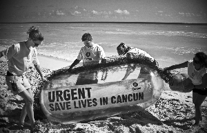 11月28日,墨西哥坎昆,環(huán)保人士在海邊游玩,他們身旁為國際樂施會放置的巨型瓶子,瓶中寫有呼吁環(huán)保的標(biāo)語。