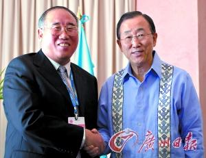 8日,正在坎昆出席聯(lián)合國(guó)氣候變化大會(huì)的國(guó)家發(fā)改委副主任、中國(guó)代表團(tuán)團(tuán)長(zhǎng)解振華(左)與聯(lián)合國(guó)秘書長(zhǎng)潘基文舉行會(huì)見(jiàn)。