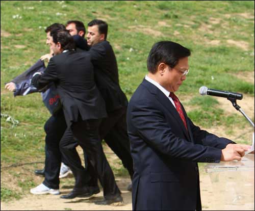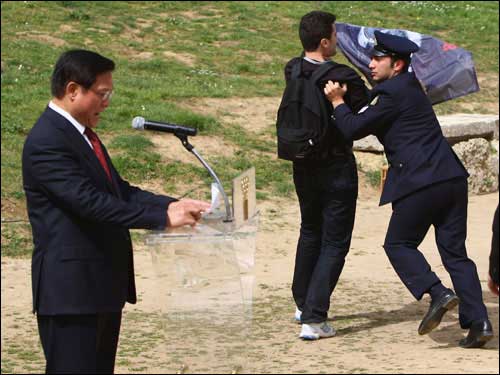 上午十一點,圣火采集儀式正式開始。陽光明媚,暖風習習,古競技場內(nèi)綠草茵茵,春花爛漫,一切都顯得生機盎然,現(xiàn)場氣氛神圣而祥和。儀式進行了十幾分鐘,北京奧組委主席劉淇上前開始發(fā)表講話,這時,記者看見來賓席上突然躥出一個人,他奔向劉淇,在劉淇身旁展開一個橫幅,另有兩個顯然是他同伙的人也加入進來發(fā)難。但他們迅即被在場的希臘警察制服,并被帶離現(xiàn)場。在這一不到兩分鐘的過程中,劉淇繼續(xù)沉穩(wěn)莊嚴地發(fā)表講話,未受到任何影響。當劉淇主席講話結(jié)束和會場傳來北京奧運圣火在赫拉神廟前已點燃的消息時,整個現(xiàn)場響起了雷鳴般的掌聲,在場的人們用這種方式表達了對奧運的熱愛和對北京奧運會的祝福。整個儀式按既定程序進行,那場小鬧劇也成了全世界愛好和平、熱愛奧運的人們的笑柄。