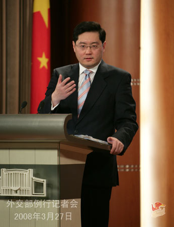 中新網(wǎng)3月27日電 據(jù)外交部網(wǎng)站消息,2008年3月27日下午,外交部發(fā)言人秦剛在例行記者會(huì)上答問時(shí)否認(rèn)中國政府要派人去澳大利亞保護(hù)奧運(yùn)火炬?zhèn)鬟f。