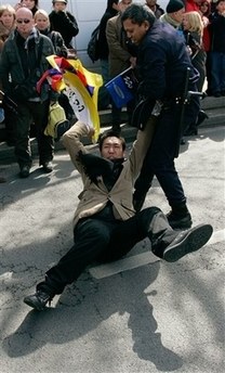 巴黎警方表示,北京奧運(yùn)火炬從艾菲爾鐵塔出來沿著塞納河傳遞了大約兩百米時(shí)受到現(xiàn)場(chǎng)破壞分子的阻撓,火炬兩次被送上安全大巴。