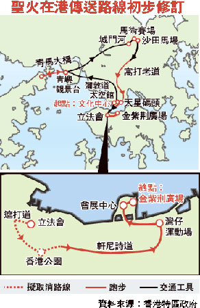 周一凌晨警方的火炬跑路線測試后,發(fā)現(xiàn)有“超時(shí)”情況,加上為減低火炬被搶或弄熄的風(fēng)險(xiǎn),有關(guān)單位計(jì)劃縮短某些不必要的行程,例如原定在港島的傳遞路線,是由立法會(huì)開始,然后經(jīng)遮打道、香港公園、軒尼詩道再去灣仔,但有關(guān)單位有意刪減兜入香港公園的地段。消息指出,香港火炬手仍會(huì)維持120人,但各人運(yùn)送路程可能略作調(diào)整。