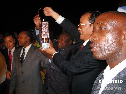這是自一九三六年奧運圣火有了傳遞活動之后,首次抵達(dá)東非地區(qū)。北京市副市長、北京奧組委執(zhí)行副主席劉敬民手持圣火燈走下飛機(jī),達(dá)累斯薩拉姆市市長亞當(dāng)·金比薩、坦桑尼亞新聞、文化與體育部部長喬治·姆庫奇卡以及坦桑尼亞奧委會秘書長巴伊親赴機(jī)場迎接。