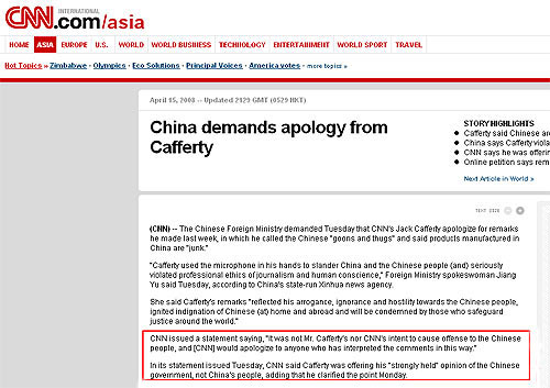 在CNN網(wǎng)站首頁中部的“Popular News”欄目中,刊登了《China demands apology from Cafferty(中國要求卡弗蒂道歉)》一文。文章前三段陳述了中國外交部對(duì)卡弗蒂言論的指責(zé)及要求卡弗蒂道歉的情況,在第四段中這樣說:CNN發(fā)表了一份聲明稱:“不論是卡弗蒂先生本人,還是CNN,都無意冒犯中國民眾;在這里,我們?cè)赶蚴艿酱搜哉撚绊懙娜藗兊狼!?/p>