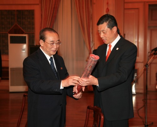 中新網4月22日電 朝鮮迎接北京奧運圣火招待會日前舉行,朝鮮最高人民會議常任委員會副委員長楊亨燮、朝鮮奧委會主席樸學先,平壤市人民委員會委員長樸寬五等出席招待會。中國駐朝鮮大使劉曉明發(fā)表了題為《祝福北京,相約平壤:共譜奧運新篇章》的主旨演講。