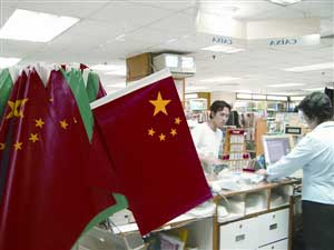 圣火傳遞中大派用場(chǎng)的國(guó)旗及區(qū)旗,近期已有居民及社團(tuán)趕購(gòu)。星光書(shū)店有售的四號(hào)懸掛國(guó)旗,銷(xiāo)售量增加了兩成。另外,同有售國(guó)旗的聯(lián)盈體育用品公司負(fù)責(zé)人陳太表示,近期國(guó)旗銷(xiāo)售量較平時(shí)上升了兩成。她說(shuō),過(guò)去舉行活動(dòng),手搖國(guó)旗及四號(hào)懸掛旗最受歡迎,然而,國(guó)旗畢竟不是一般商品,商家不會(huì)以純商業(yè)角度去訂價(jià)。以手搖小紙旗為例,僅售兩元;至于四號(hào)懸掛國(guó)旗則賣(mài)六十元左右,不會(huì)定價(jià)過(guò)高。