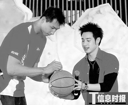 易建聯(lián)給潘瑋柏簽名。馮愛(ài)軍 攝