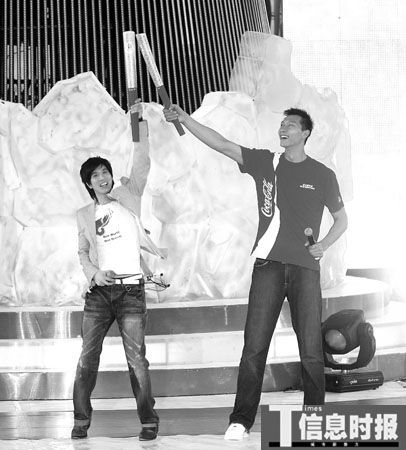晚會(huì)現(xiàn)場(chǎng)易建聯(lián)與王力宏進(jìn)行火炬對(duì)接。馮愛(ài)軍 攝