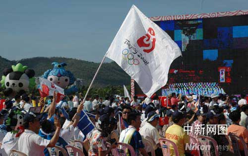 今天的三亞的天空格外晴朗,起跑儀式在鳳凰島“火鳳凰”廣場(chǎng)舉行,取“鳳鳴和諧”之寓意,在圣火傳遞起跑儀式現(xiàn)場(chǎng),還鑲嵌了本站傳遞208位火炬手的手模。在一個(gè)簡(jiǎn)短的儀式之后,北京奧組委副主席劉敬民點(diǎn)燃“祥云”火炬,海南省委書記衛(wèi)留成將火炬交給了第一棒火炬手、奧運(yùn)冠軍楊揚(yáng)。
