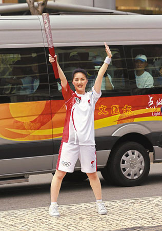 楊千嬅是澳門區(qū)火炬手代表之一,其父母也專程去為她打氣,可惜由于站錯(cuò)了等候的位置,以致其父母看不到她拿著火炬一刻的跑姿,令兩老也感失望。