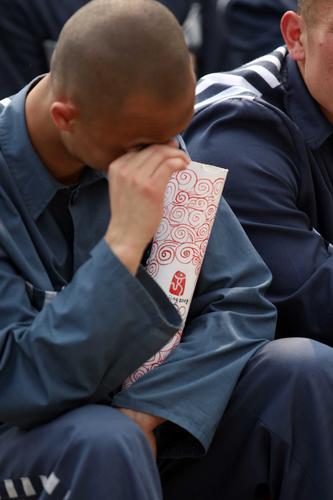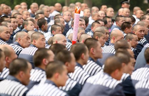 2008年5月6日,北京某監(jiān)獄,由服刑人員自制的祥云火炬在各監(jiān)區(qū)傳遞!皣(guó)內(nèi)火炬?zhèn)鬟f儀式”上,當(dāng)圣火經(jīng)過地圖上的家鄉(xiāng)時(shí),親切的旋律及關(guān)于家鄉(xiāng)風(fēng)土人情的介紹旋即傳到在場(chǎng)每位服刑人員耳畔,不少人流下思鄉(xiāng)悔過的淚水。