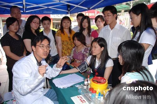 5月14日,福州各獻血屋、流動獻血站人頭攢動,市民們紛紛競相向四川地震災區(qū)傷員獻血。這是當日午時,福建省血液中心福州東街流動獻血站陳國龍醫(yī)生,一邊為獻血民眾作血檢一邊不厭其煩地向人們講解怎樣“應急獻血登記”,以備國家衛(wèi)生部統(tǒng)一調(diào)血安排。 中新社發(fā) 鄭祚聲 攝