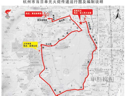 據(jù)悉,杭州段的火炬接力傳遞活動(dòng)于五月十八日上午八點(diǎn)整將在浙江省人民大會(huì)堂東門外廣場(chǎng)舉行起跑儀式,主要環(huán)繞杭州西湖進(jìn)行傳遞,同時(shí)還將經(jīng)過雷鋒夕照、柳浪聞鶯、湖濱路名品街、西湖博覽會(huì)博物館等杭州的地標(biāo)建筑和著名景點(diǎn),最后將于十一點(diǎn)半在杭州黃龍?bào)w育館舉行奧運(yùn)火炬接力杭州站結(jié)束儀式,全程預(yù)計(jì)歷時(shí)三小時(shí)四十五分鐘,被定名為“和諧之旅——生活品質(zhì)之路”!