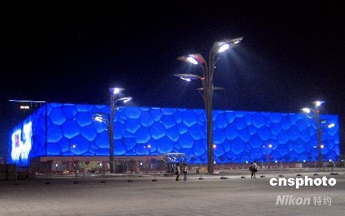 圖:夜幕下璀璨的“鳥巢”和“水立方”