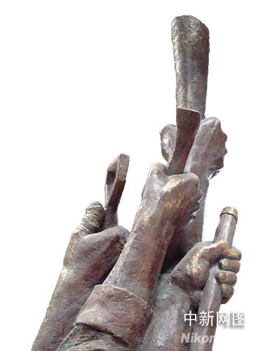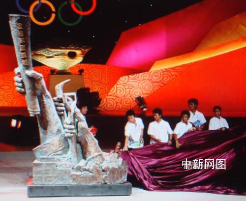 中新網(wǎng)北京6月2日電 (記者 賴海隆)5月31日晚,一尊名為“高擎圣火,克難興邦”的“5.12”大型紀(jì)念雕塑出現(xiàn)在“2008奧運(yùn)景觀雕塑方案征集大賽頒獎(jiǎng)活動(dòng)”現(xiàn)場(chǎng)。專程從重災(zāi)區(qū)趕來(lái)的十余名北川中學(xué)的幸存者與作者一起共同為此尊雕塑揭幕。這一象征中國(guó)人表達(dá)自強(qiáng)不息,重建家園,辦好奧運(yùn)決心的一幕,將現(xiàn)場(chǎng)氣氛推向了高潮。