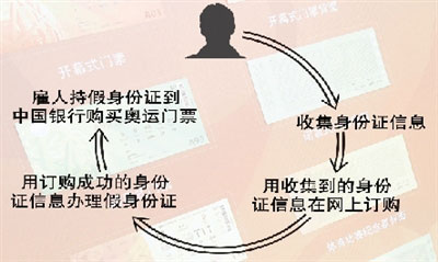 5月13日,在中國職工之家內(nèi)的中國銀行,兩名男子持假身份證購買奧運門票。警方將兩人帶走審訊后,成功搗毀了一個搜集身份證信息制造假證,網(wǎng)上訂票后高價倒賣的團伙。該團伙的奧運發(fā)財夢,因假證被識破而破滅。