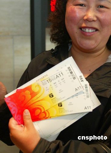 資料圖片:5月5日,北京奧運會第三階段門票銷售正式啟動。由于這一階段采取“先到先得”的售票原則,公眾購票熱情十分高漲。據奧運票務中心統(tǒng)計,截至當日上午11時40分,男足半決賽和決賽、男子110米欄半決賽、男籃預賽等8個場次的門票已售罄。第三階段銷售將投放奧運門票138萬張,涵蓋16個大項的244個比賽場次。圖為一位民眾買到票后異常高興。 中新社發(fā) 富田 攝