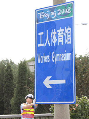 奧運(yùn)專用指路標(biāo)識(shí)的施工劃分為三個(gè)階段:6月10日至6月17日完成環(huán)路輔路等次要道路的奧運(yùn)專用指路標(biāo)志施工;6月18日至6月25日完成環(huán)路主路等主要道路的奧運(yùn)專用指路標(biāo)志施工;6月25日至6月30日完成全部奧運(yùn)專用指路標(biāo)志施工。