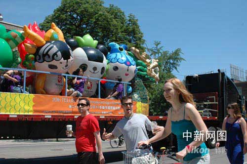 北京奧運(yùn)吉祥物“五福娃”參加第20屆多倫多國際龍舟節(jié)花車巡游。