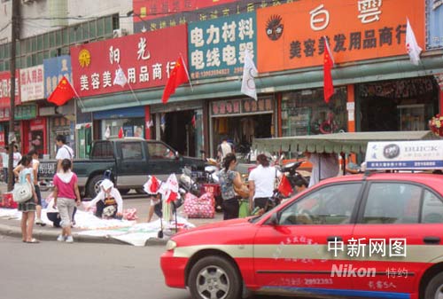 運(yùn)城街頭各家商戶門面都懸掛奧運(yùn)彩旗。作者 長(zhǎng)年