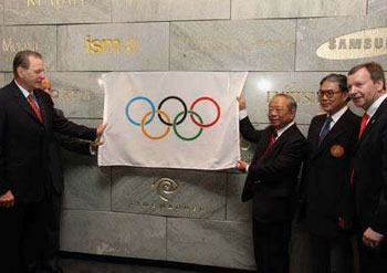 洛桑當(dāng)?shù)貢r(shí)間3日上午11時(shí)半,國際奧委會(huì)奧林匹克博物館在其捐獻(xiàn)者留名墻前,舉行石匾揭幕儀式,以表彰香港賽馬會(huì)捐助100萬美元,這也是繼中國石化、中國寶鋼、中國銀行和愛國者之后,第五塊鑲嵌在留名墻上的中國贊助商。