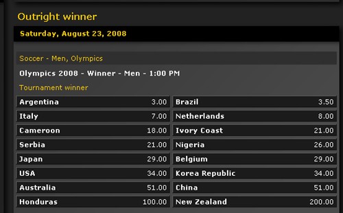 除了阿根廷國奧以3倍賠率高居榜首之外,從2-16名的隊(duì)伍分別為:意大利(7)、荷蘭(8)、喀麥隆(18)、科特迪瓦(21)、塞爾維亞(21)、尼日利亞(26)、日本(29)、比利時(shí)(29)、美國(34)、韓國(34)、澳大利亞(51)、中國(51)、洪都拉斯(100)和新西蘭(200)。