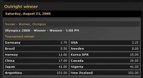 中新網(wǎng)7月10日電 北京奧運(yùn)會開賽在即,足球比賽將于8月6日至23日上演。世界著名博彩公司BWIN日前分別為奧運(yùn)男女足比賽開出了賠率。在男足方面,阿根廷國奧隊(duì)最被看好,BWIN開出了1:3的賠率;而女足方面,德國隊(duì)以2.75倍的賠率高居榜首。